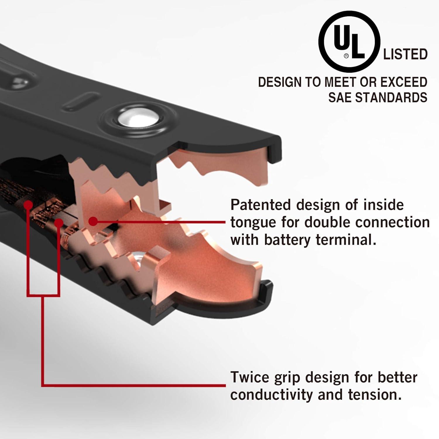 Patented design clamps covered with non-conducting rubber, Twice grip design for better conductivity and tension. Fits top and side post batteries