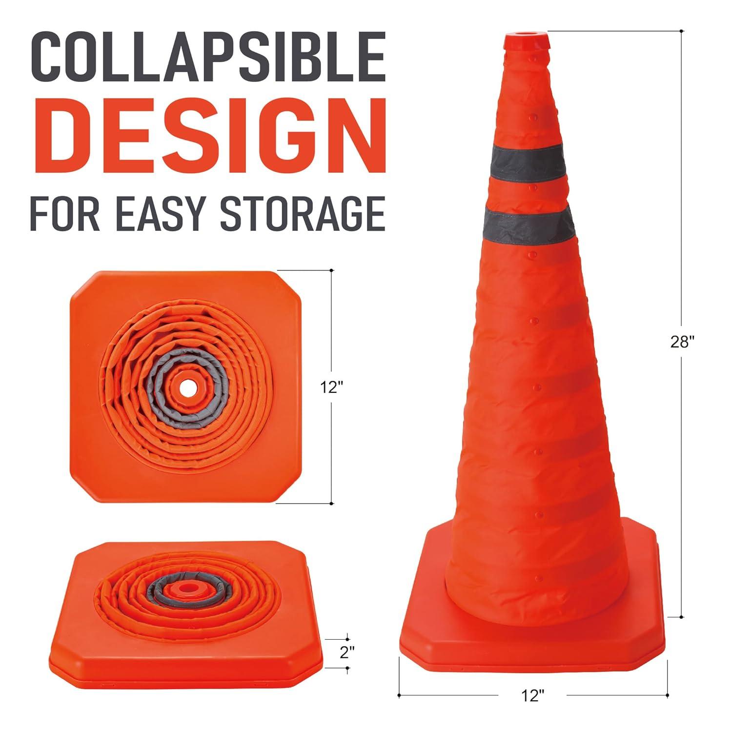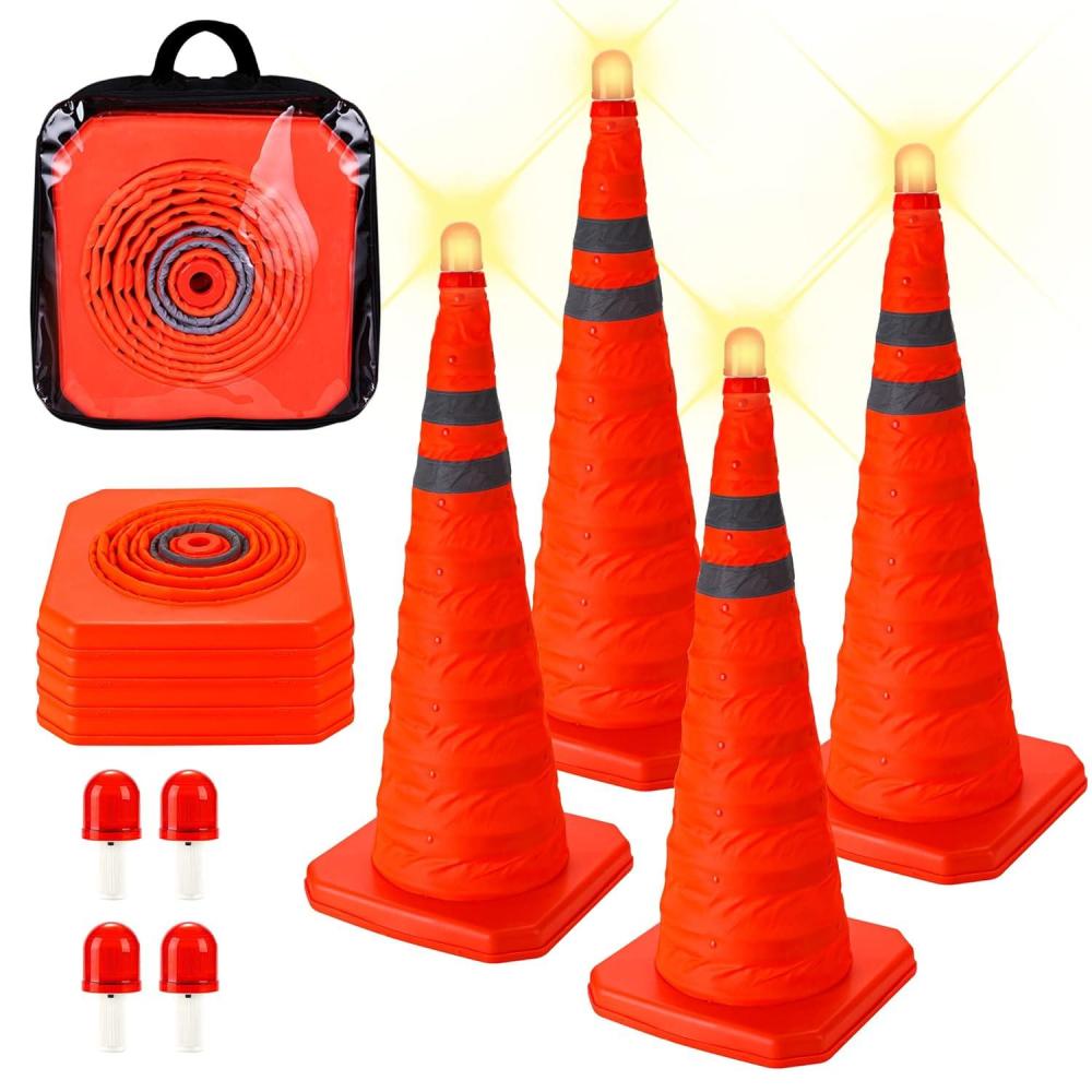 CARTMAN 4 Pack 28 Inch Collapsible Traffic Cones with LED Light, Multi Purpose Pop up Reflective Safety Cones, Pack of 4, Battery Included