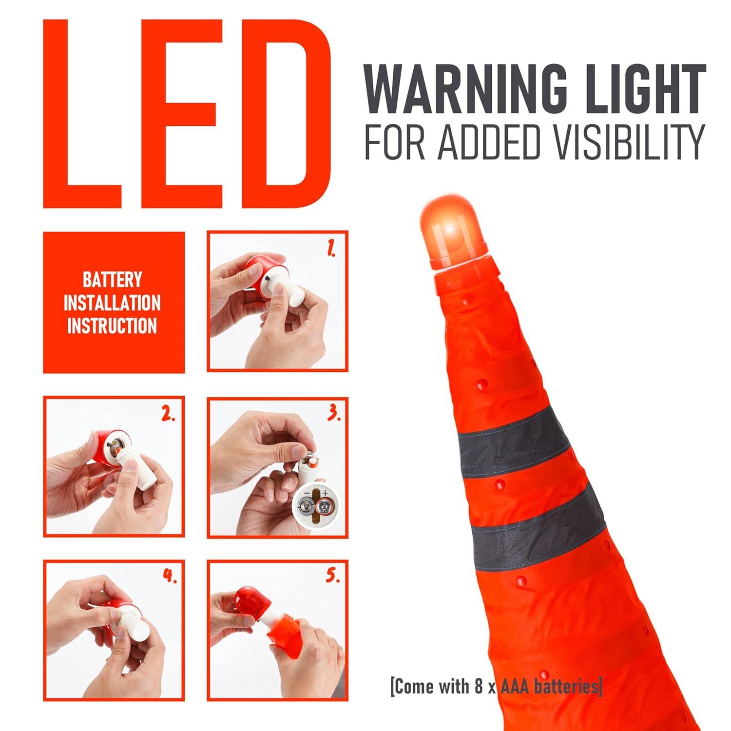 8xAAA BATTERY INCLUDED – Can be used immediately upon receipt. Fluorescent safety cones with two silver reflective bands and LED light makes it very eye-catching and easy to remind people.