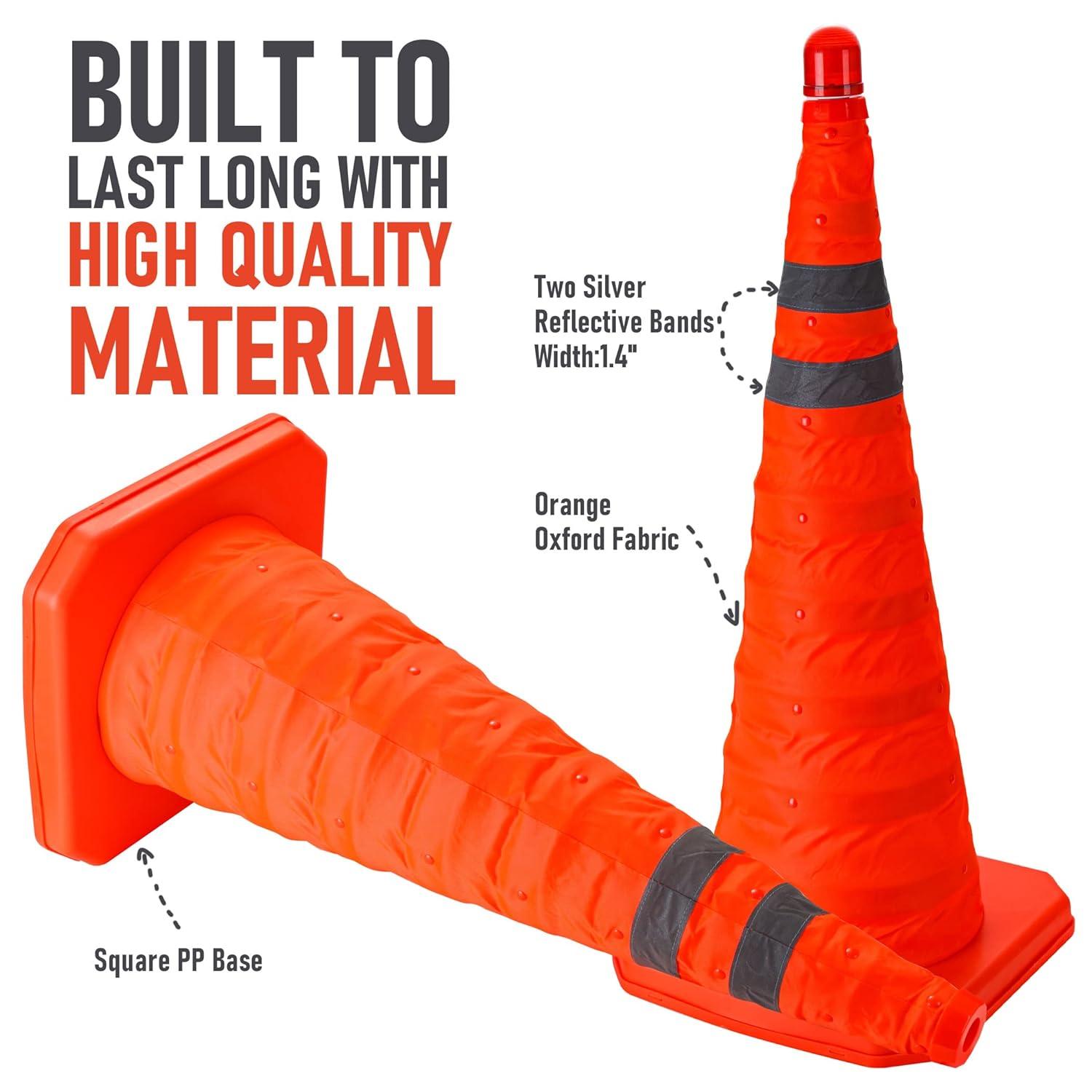 PREMIUM QUALITY – Our traffic cones are constructed of orange waterproof solid oxford fabric and silver water-resistant reflective material, which is odorless, impact-resistant, and highly durable.