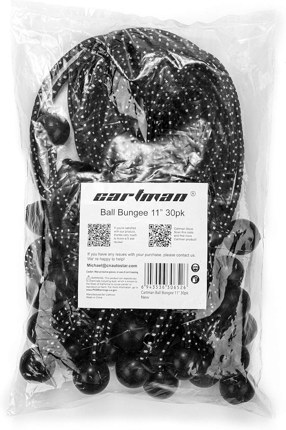 Each package includes 30 pack black tarp ties downs bungee cords. Length: 11-Inch (including ball), Streches to 14-Inches