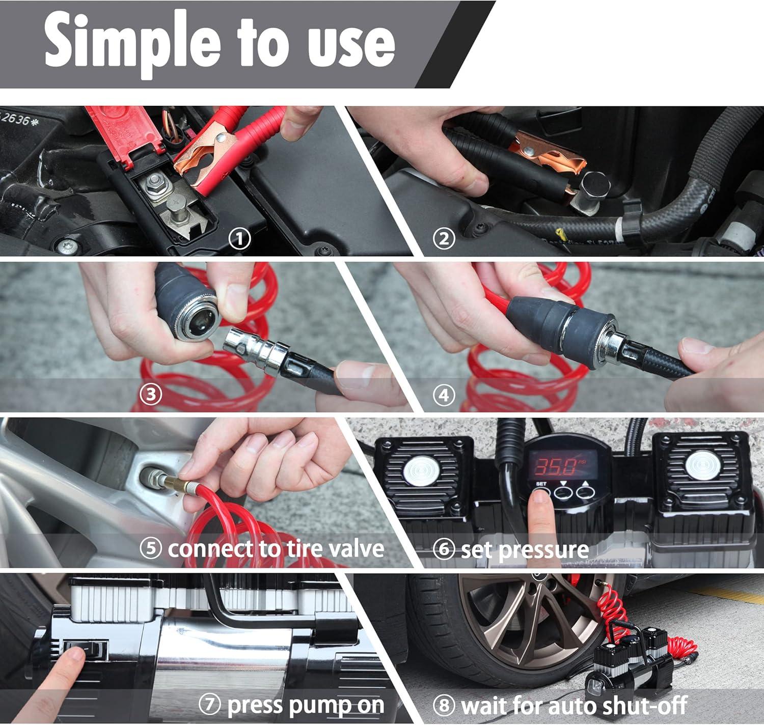 EQUIPPED with 5M extension hose and high quality battery clamp, extension hose meet the needs of the long-wheelbase vehicle inflatable, battery clamp connect directly to your vehicle battery.