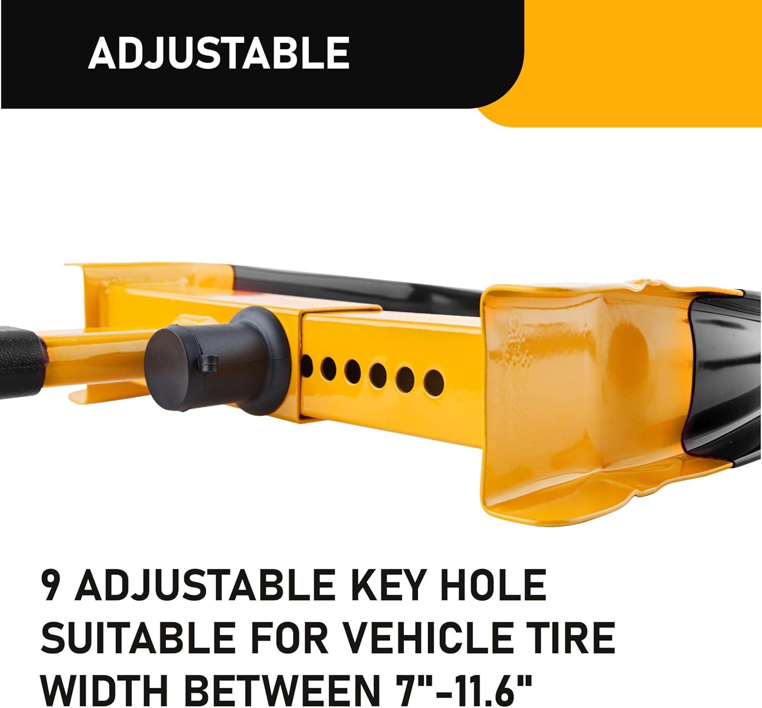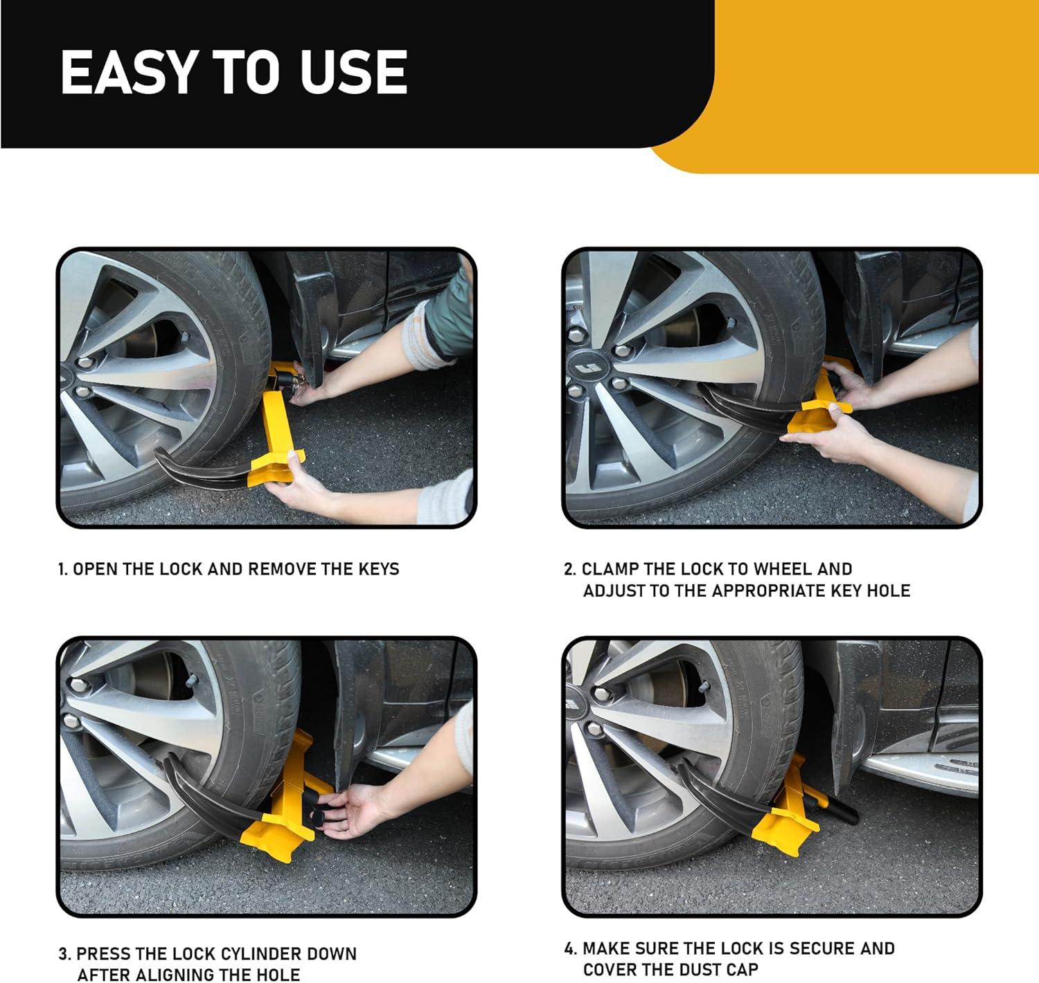 Universal wheel locks can be adjusted to fit 7 to 11 inch width tires for cars, camper, trucks, trailers, motorcycles, ATV's, RV's, golf carts, etc.