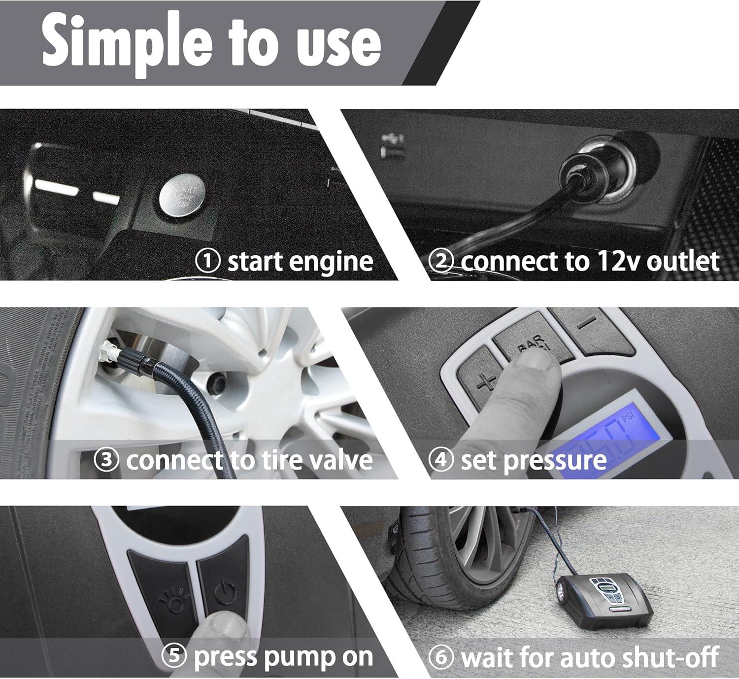 [AUTO SHUT-OFF FUNCTION] The portable air compressor will automatically shut off when reaching desired tire pressure to prevent over-inflation, ensuring your safety while driving.