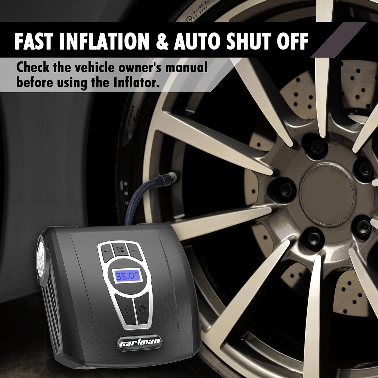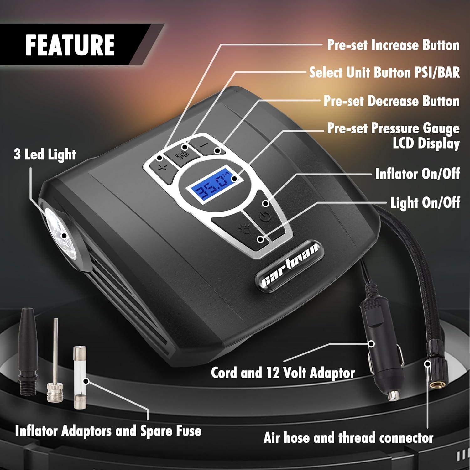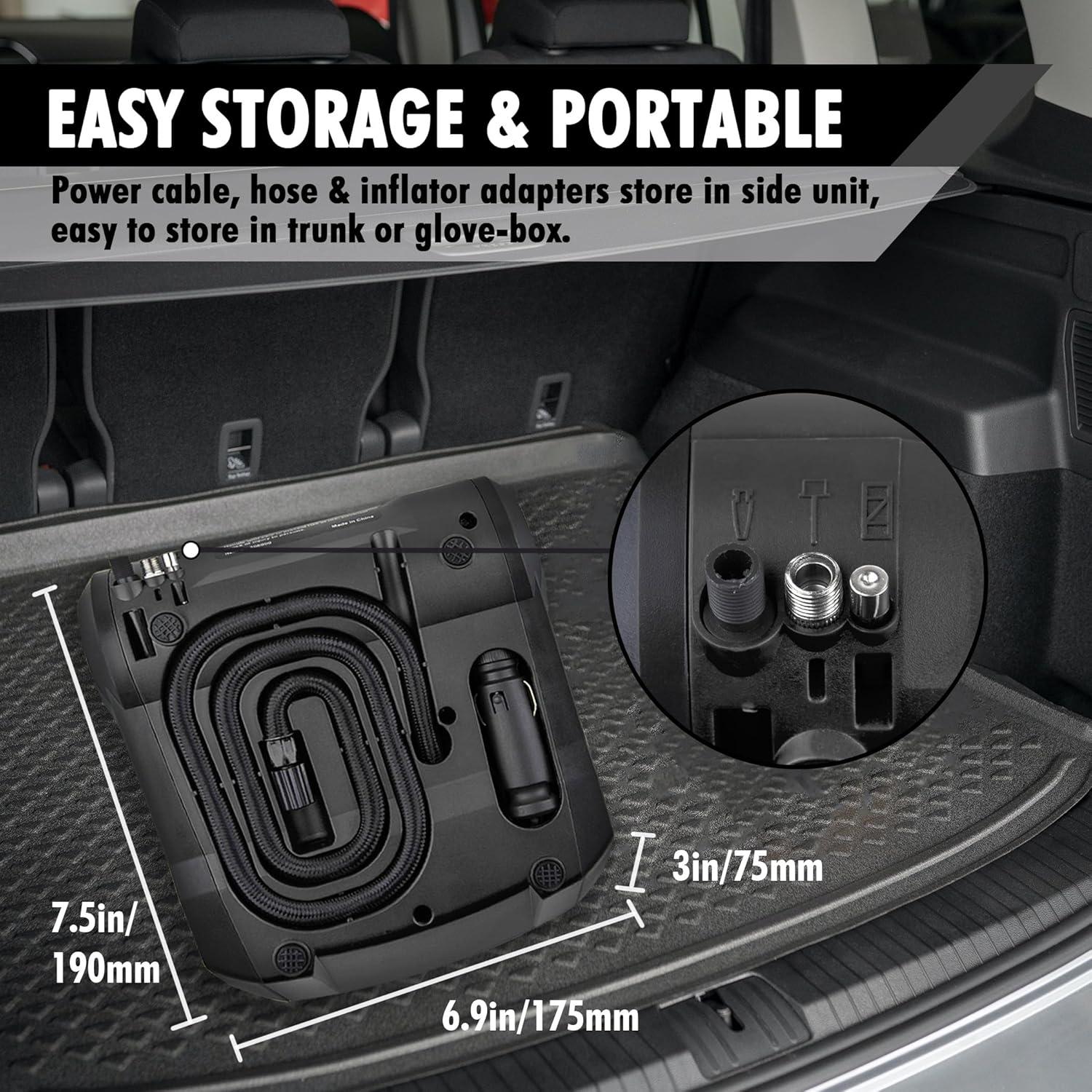 [EASY TO USE & FAST INFLATING] The car air pump will inflate your car tires in 7 minutes. Plug it into your car’s 12V power outlet, then screw the thread connector onto tire’s valve stem, set the desired pressure level for your tires, press the switch to start inflation, and it does all the work for you. Our car tire inflator is easy to store and carry, which makes it easier and more convenient to inflate your tires in an emergency.