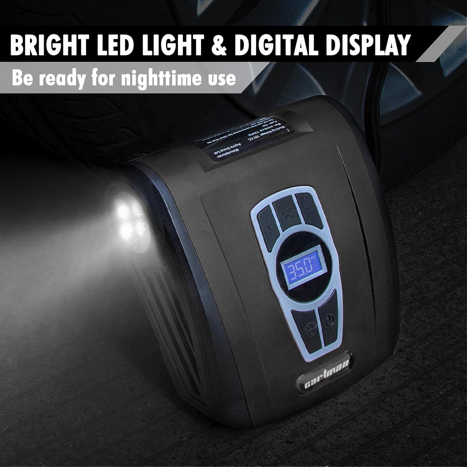 [DIGITAL DISPLAY & LED LIGHT] To solve the problem of nighttime inflation, the electric air pump is equipped with a digital display and LED lighting to support your inflation needs in low light conditions.