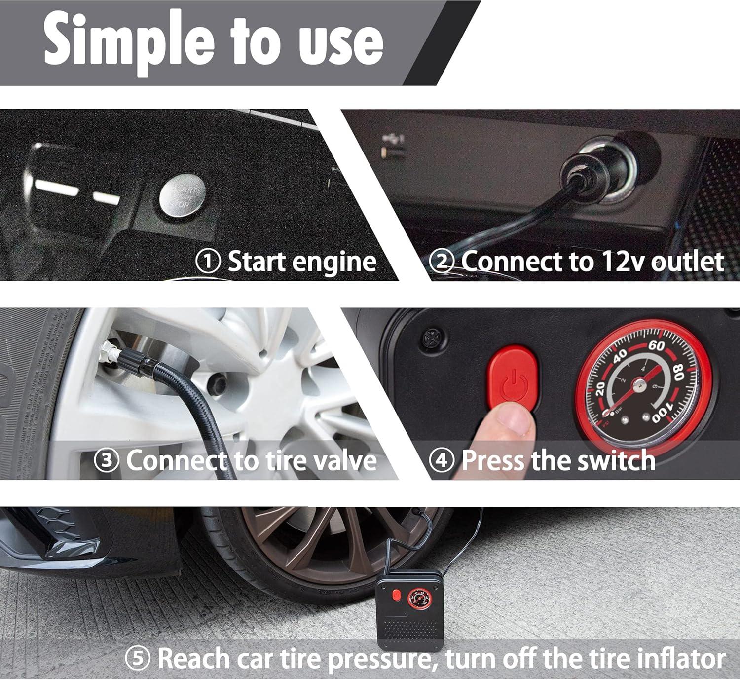 The car air pump can inflate 0-35 PSI to standard automobile tires in 5 minutes, quickly solving your emergency and saving you time and money.