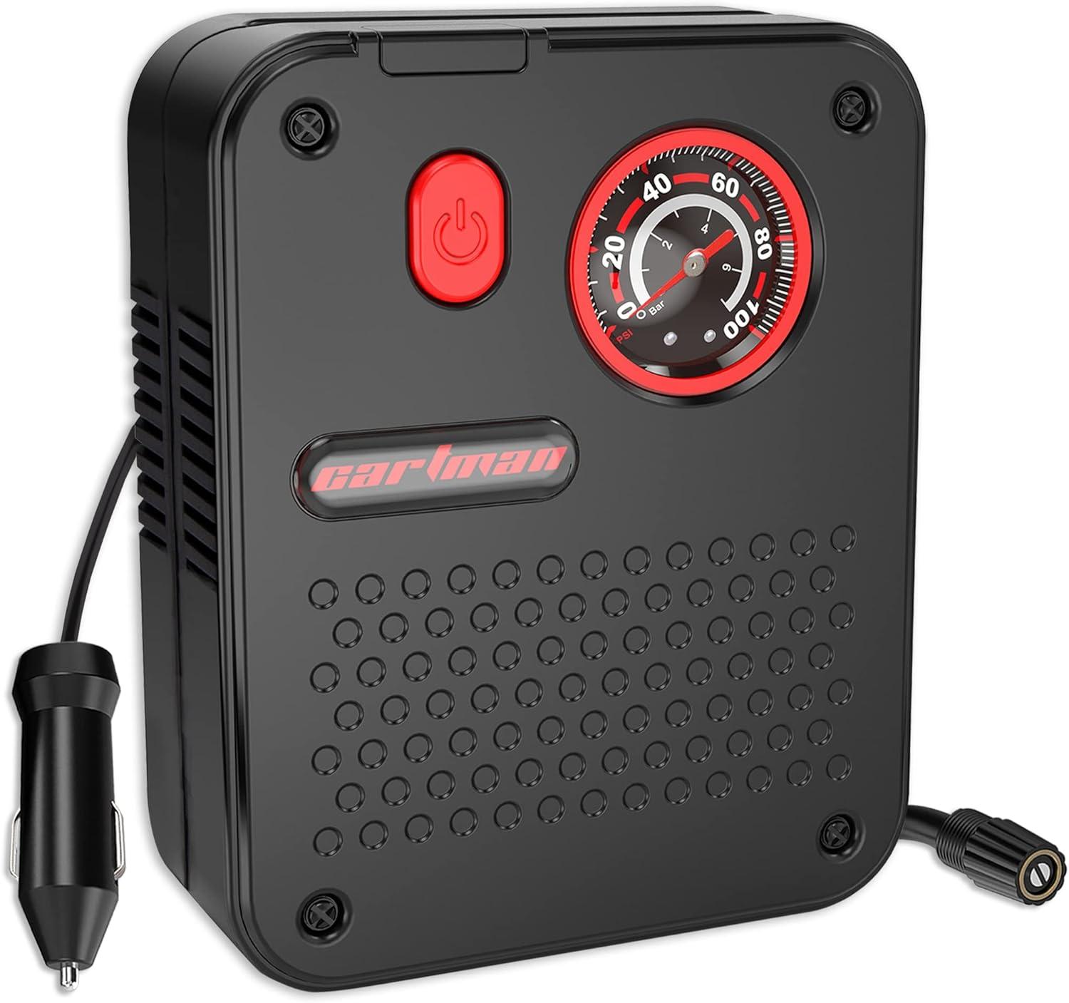 The tire air compressor comes with 2 extra adapters, which makes it perfect for car, motorcycle, bicycle tires, air mattresses, inflatable boats, balls and other inflatable products.
