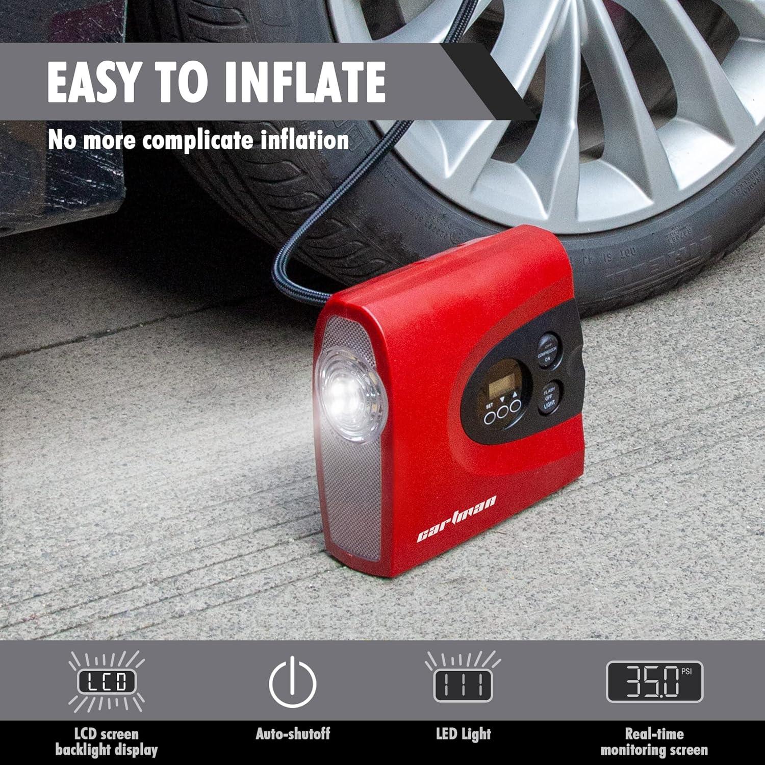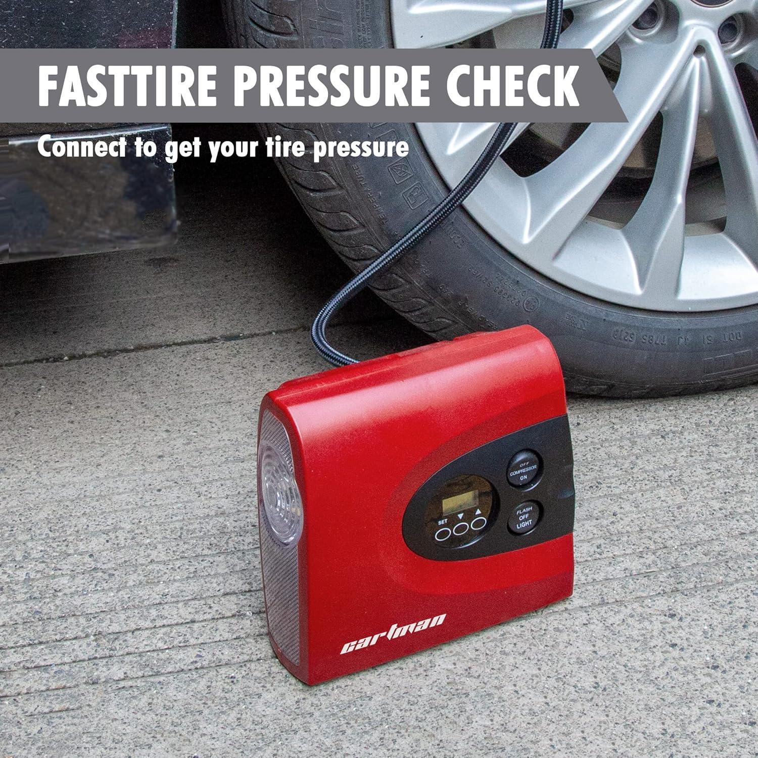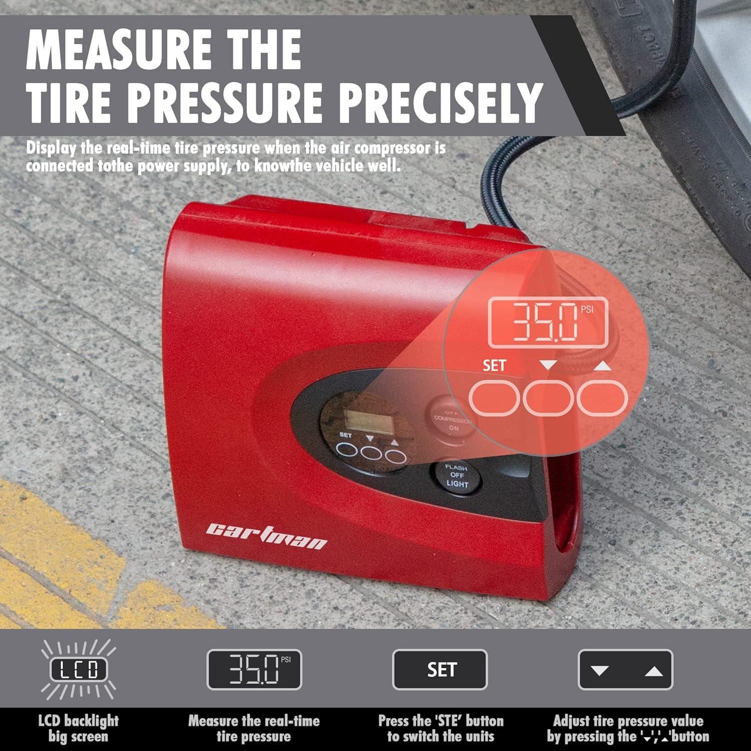 AUTO SHUT OFF CARTMAN Tire Inflator provides you with rest-assured using experience based on the auto-shut off function. Preset the desired pressure level and start inflating job. CARTMAN Tire Inflator can inflate the 195/55/R15 car tire from 0 to 30psi under 3.5 minutes. Professionally calibrated to always return a reading within 1% of the pressure of your tire.