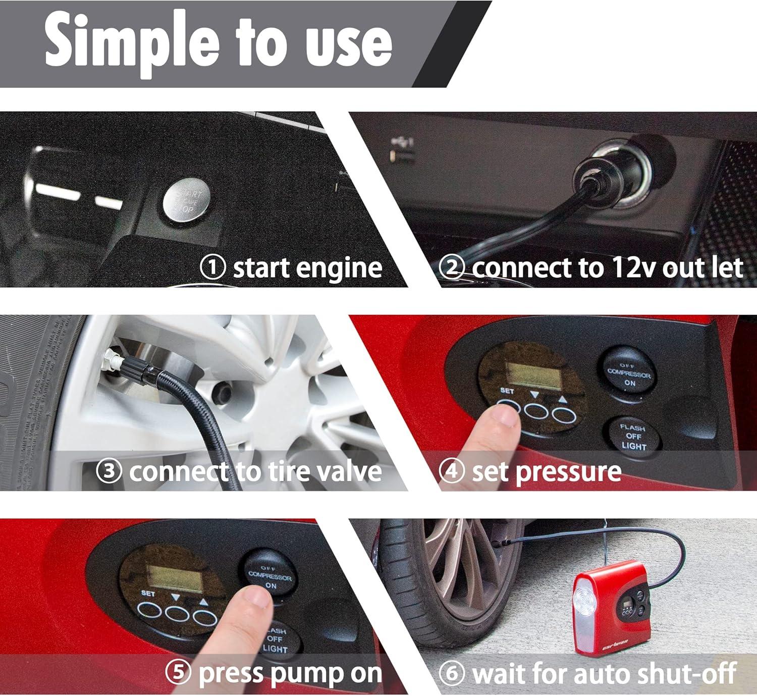 Suitable air pressure unit One-click to change pressure units among PSI, kPa, BAR and KG/CM 2 Nozzles and Extra Fuse Included. Inflates any valve on cars, SUVs, motorcycles, and bicycles; the included accessories quickly inflate balls , balloons and mattresses.