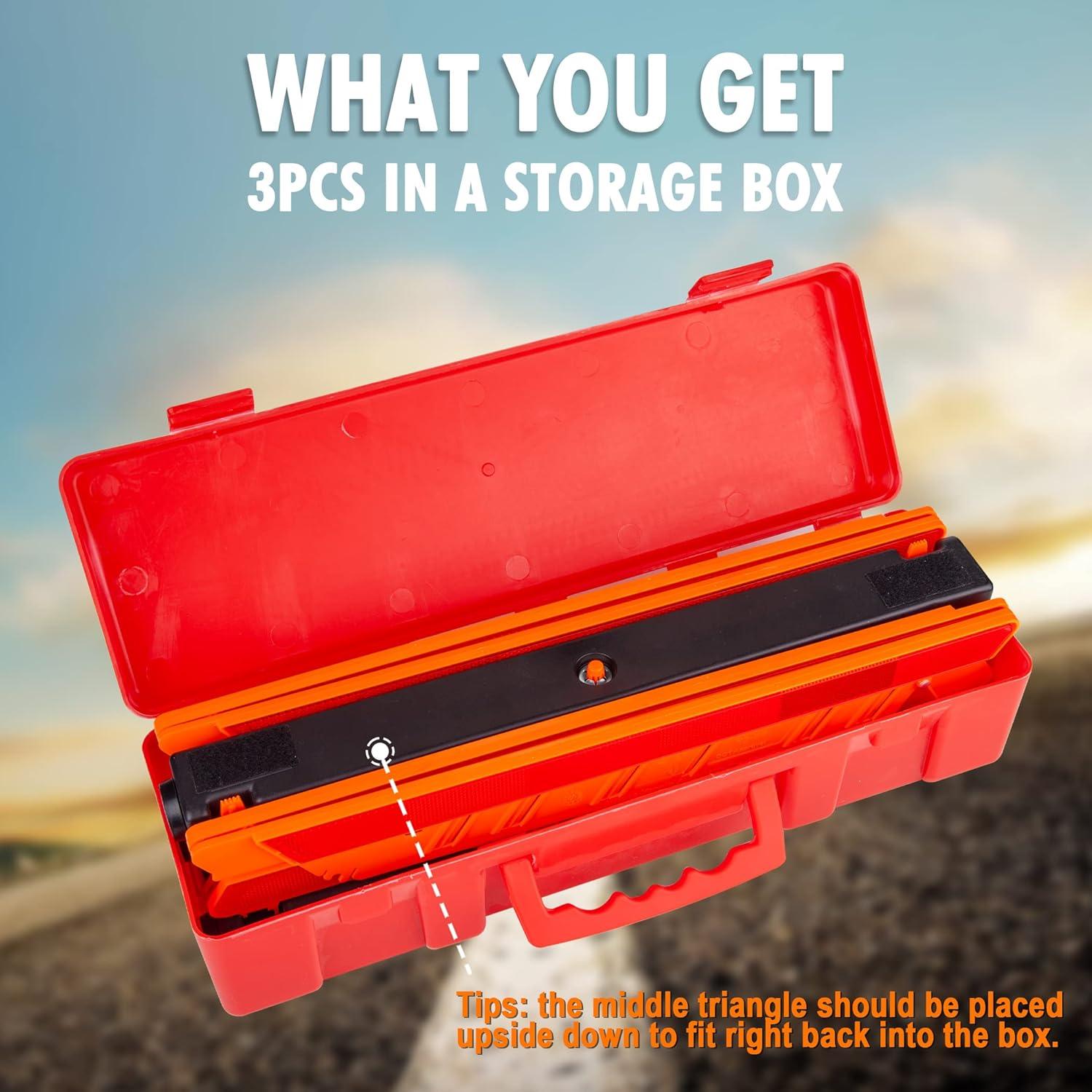 EASY SET UP – No tools required. The folding design and snap-fit design of emergency triangles make it very easy to use and also meet the need of a quick and convenient storage.