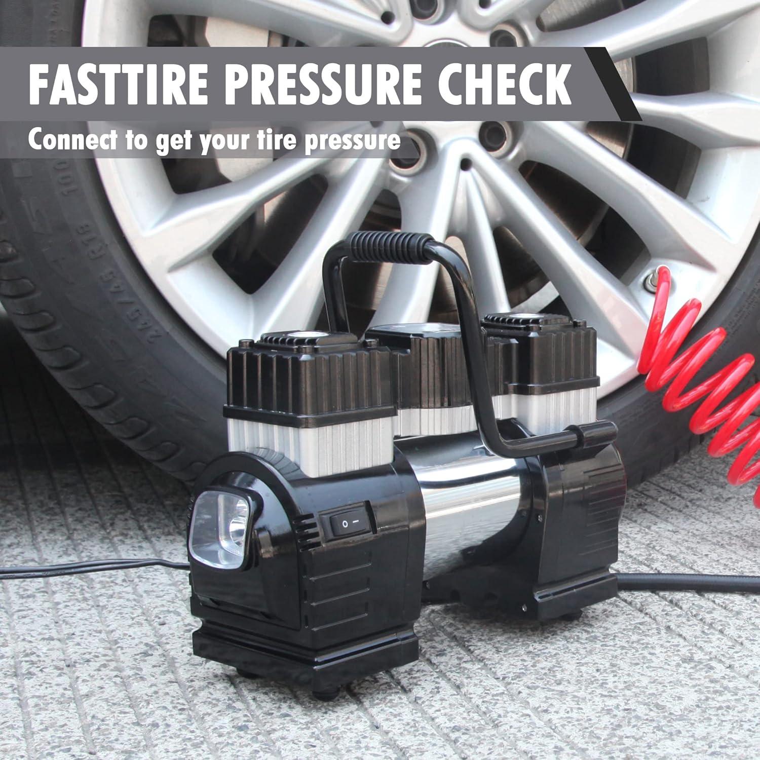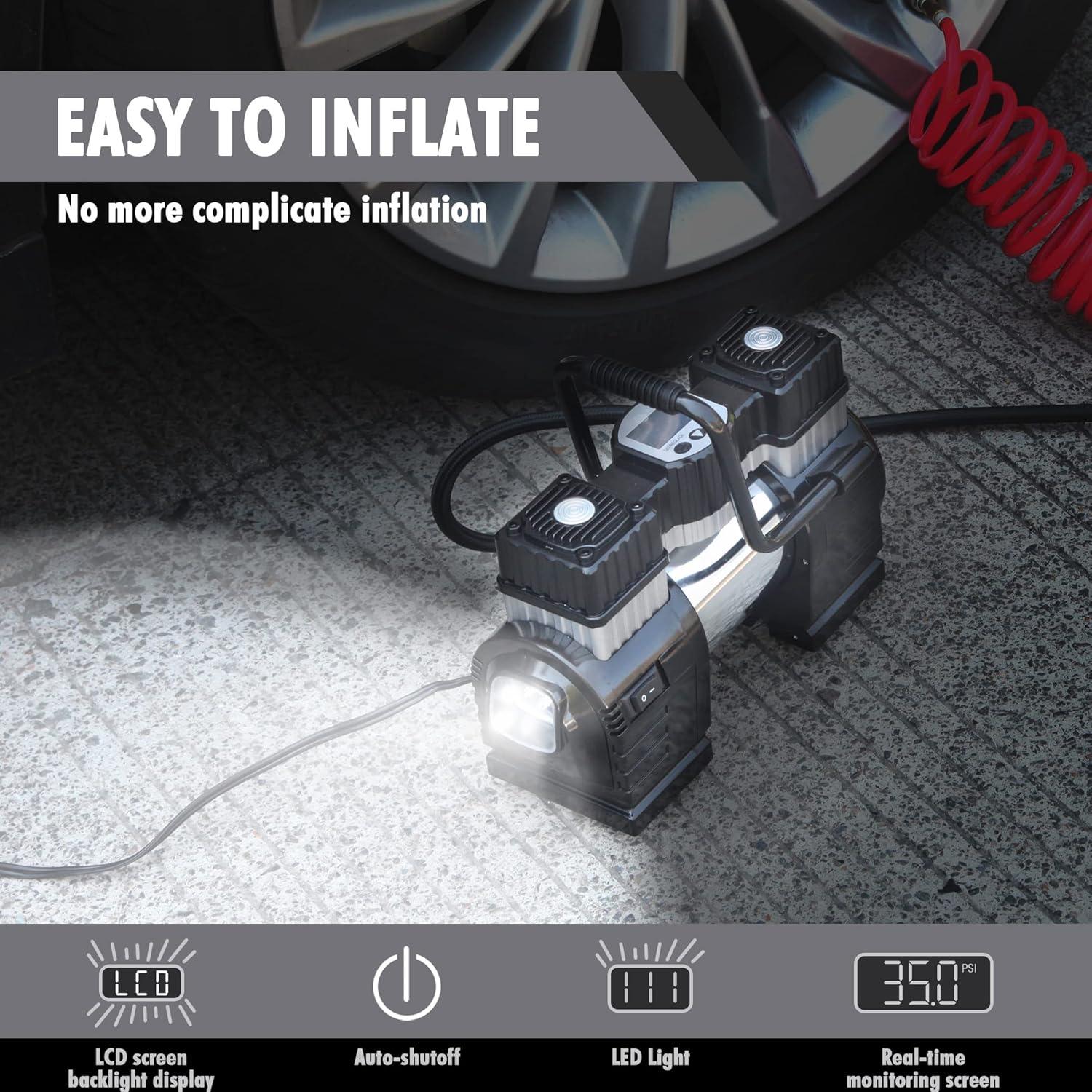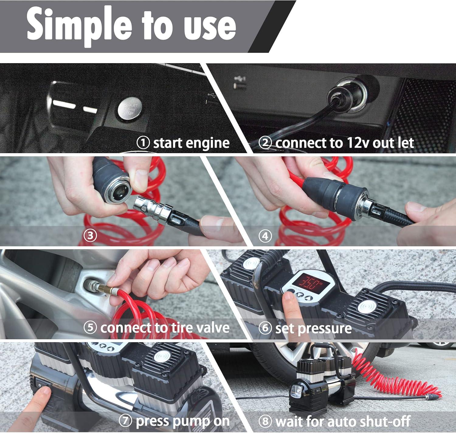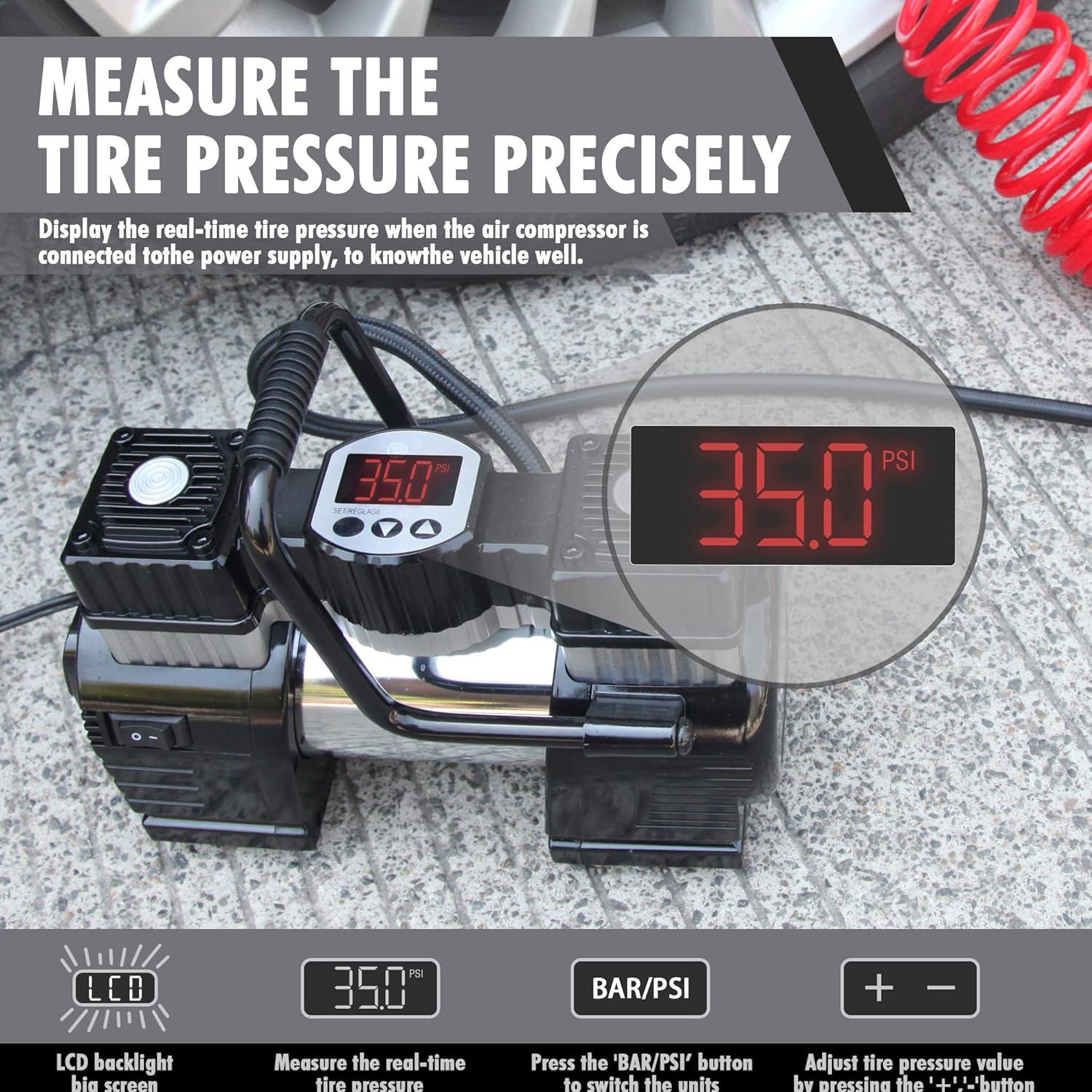 WORKS: particularly suitable for SUVs, trucks, vans, RVs, crossovers, MPVs, campers, trailers, minivans, also can use for cars, motorcycles, golf carts, bicycles, and more. EQUIPPED with 5M extension hose and high quality battery clamp, extension hose meet the needs of the long-wheelbase vehicle inflatable, plug connect directly to your 12V Cigarette lighter.